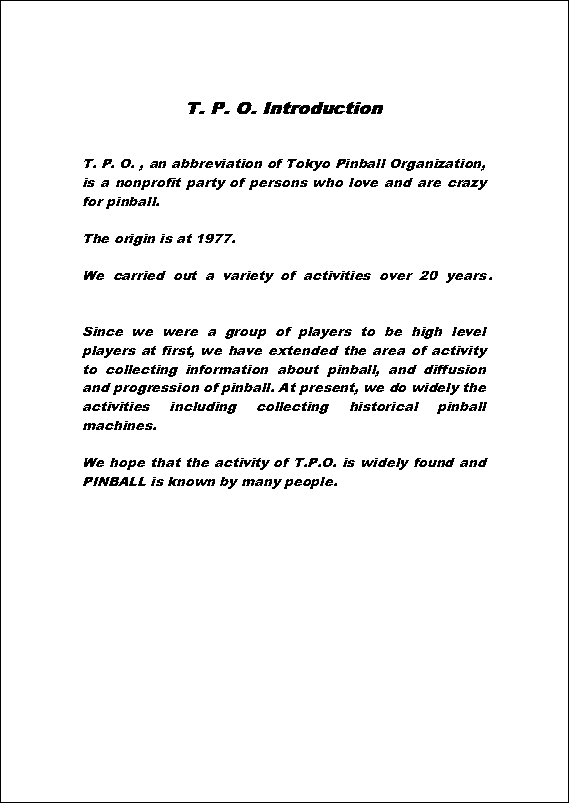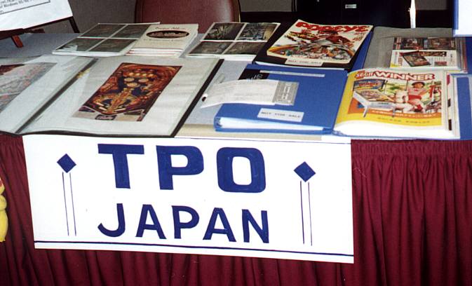 T.P.O.は、日本から初めてピンボールエキスポにブースを出展した。出展内容は、非営利団体であるので基本的に販売物はほとんどなく、TPOの活動紹介を中心とした展示内容とした。なお、隣のオランダのピンボール協会(DUTCH PINBALL ASSOCIATION)等は、活動紹介など何もなく、トレーナーやポスターなどの販売だけを行っていた。 TPOブースは、初日午後の展示会場オープン前に準備し、そこから土曜夜まで展示を行った。最終日の日曜の朝に完全撤去。 |