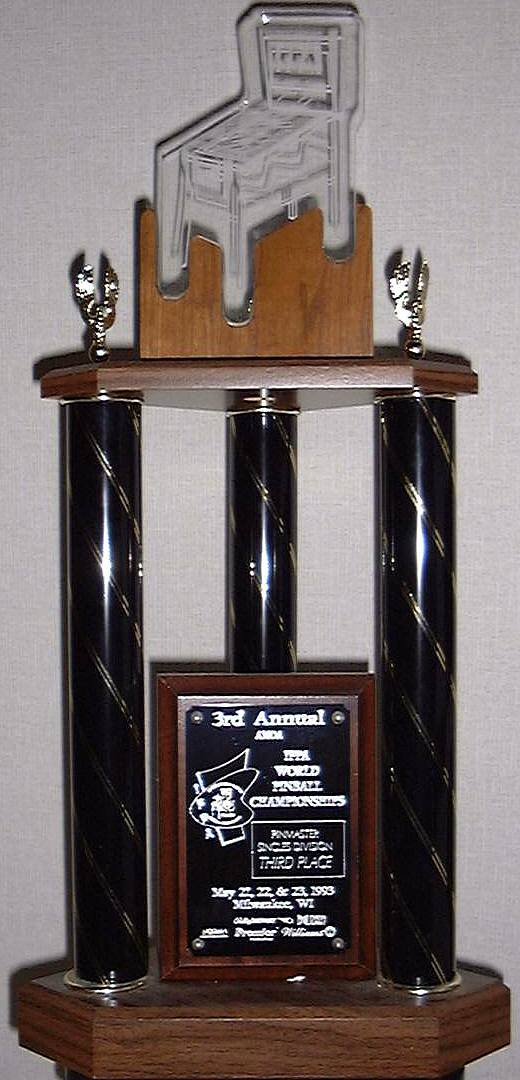 プレイでがんばろうと思っていた頃に、ピンボールエキスポのフリップアウトやIFPA、PAPA等の米国の大会に出た。96年末までに9回出場し、7回予選を突破し、5回入賞した(トロフィーを5個獲得、うち1位のトロフィーは2個)。今では良い思い出である。その後、プレイ以外に力点を置くようになり、情報整理やホームページ作成などを行ってきたが、前々からも目標の1つであるピンボールオーナー(マシンを自分で持つこと)となったので、ようやくピンボール愛好家として認められるようになったかなと思う。 (右の写真は1993年度IFPA世界大会ピンマスターシングルス3位のときにもらったトロフィー) |