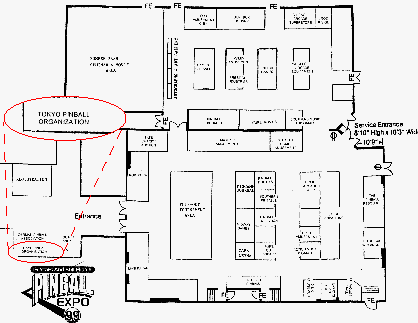 | TPOブースは、展示会場の入口前にある受付の前のエリアの中に設置されたが、ここには、TPOのブースの他に、DUTCH PINBALL ASSOCIATION等の米国以外のピンボール団体・協会のブースが並んで設置された。TPOブースは、このエリアの中で一番右端の壁側に接する部分であった。 |